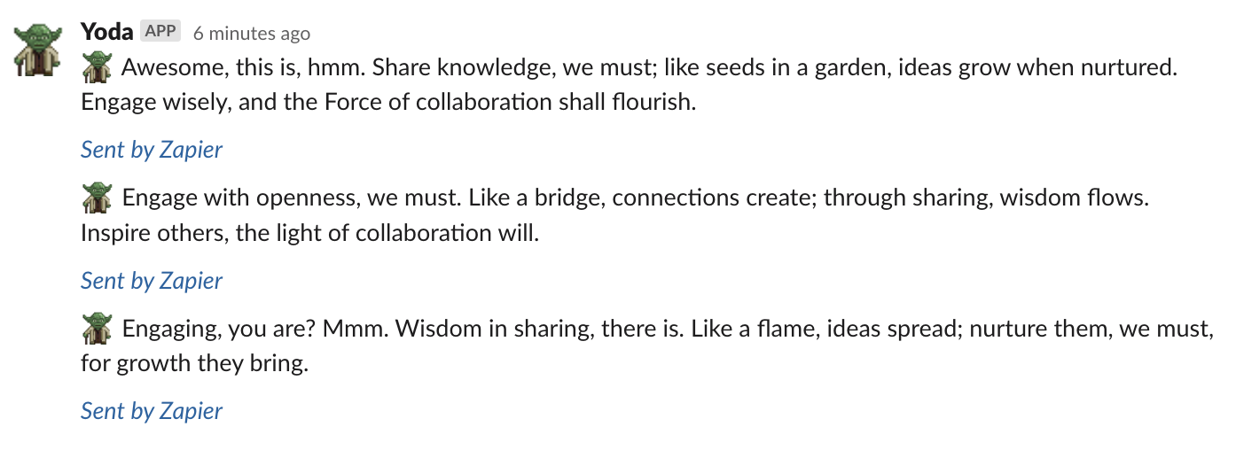 Absolutely. While the template comes pre-configured for Yoda-style wisdom, you can easily modify it to feature quotes from any character, historical figure, or even create a custom persona that represents your company values. For example, the Zapier team has an infamous Taylor Swift bot.